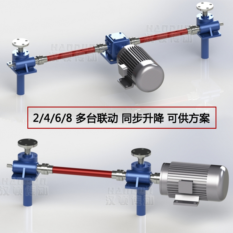 電機在升降機的一端,與其中一臺升降機的入軸連接。另一端升降機的入軸可以連接編碼器或手輪,如果不需要也可以不加。