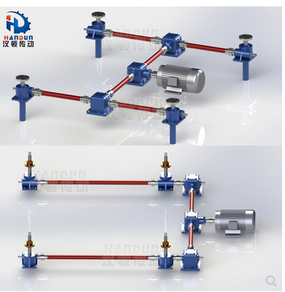 三臺升降機出軸用一臺T型轉(zhuǎn)向器連接,升降機呈三足鼎立狀態(tài),電機連接在中間一臺升降機的出軸上。
