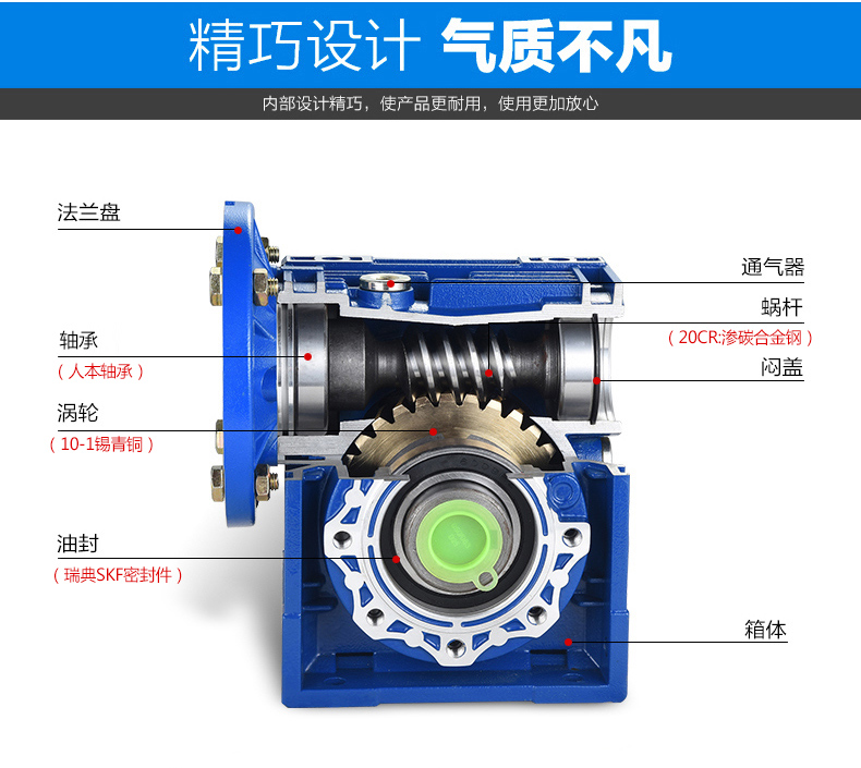 RV系列鋁合金微型蝸桿減速器是我司研制的新一代實(shí)用型產(chǎn)品,符合Q/JF01-1999標(biāo)準(zhǔn),按最新國(guó)家標(biāo)準(zhǔn)設(shè)計(jì),采用新工藝、新材料生產(chǎn)、吸收了國(guó)外技術(shù)并加以創(chuàng)新,使其整機(jī)性能優(yōu)于國(guó)內(nèi)同類型產(chǎn)品。適用于食品、皮革、紡織、醫(yī)療、玻璃、陶瓷、化工、輕工等機(jī)械設(shè)備的減速傳動(dòng),是現(xiàn)代化傳動(dòng)系統(tǒng)實(shí)現(xiàn)單機(jī)傳動(dòng)及生產(chǎn)流水線上實(shí)現(xiàn)機(jī)電一體化的最佳選擇。該系列產(chǎn)品顯著特點(diǎn):方箱外形,優(yōu)質(zhì)鋁合金壓鑄箱體,美觀大方;散熱性能好,承載能力大;多面安裝,空心軸輸出軸結(jié)構(gòu),另配有各種輸入、輸出方式,并能方便地與其他傳動(dòng)機(jī)械組合,適應(yīng)性能強(qiáng)傳動(dòng)平穩(wěn),噪音小,安全可靠,經(jīng)濟(jì)耐用。